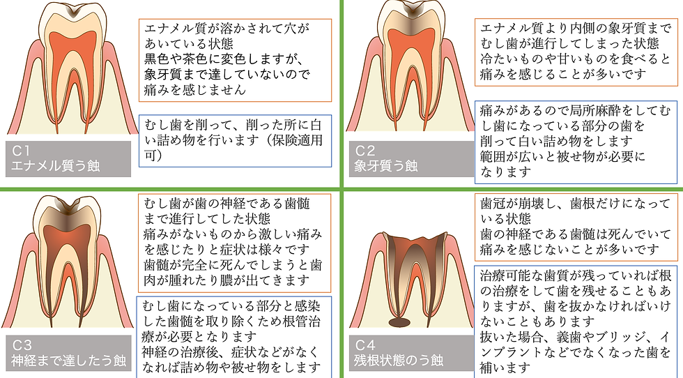 虫歯は症状がでるまで気づきにくく、進行すると最悪の場合、歯を失ってしまう病気です。虫歯は予防し、早期発見ができれば歯を削る量が少なく治療できます。放置すると歯の神経(歯髄)まで細菌が感染し、歯髄をとることになります。最悪の場合、歯を抜くことに繋がります。